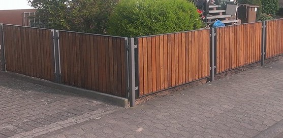 Zaun aus Stahl mit Lärchenholzfüllung feuerverzinkt, pulverbeschichtet